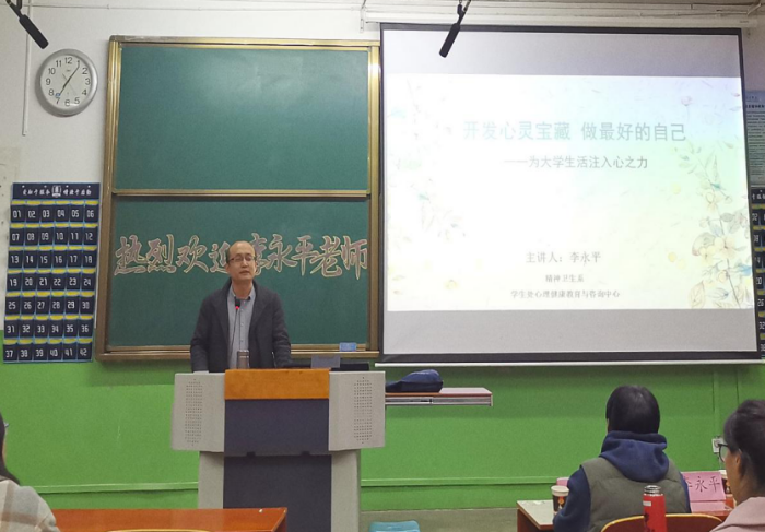 李永平老师以“开发心灵宝藏 做最好的自己”为题,从一封信的启发、一本书的意义、学习的真谛及如何获得成功快乐幸福四个方面展开。李老师从一名曾经做过心理咨询的专升本考研二战的学生的案例说起,迅速拉近与学生们的心理距离。李老师还将心理学与中国传统文化深度融合,从“中华文化中的学习”和“心理学中的学习”两个方面阐明学习的真谛,鼓励同学们立大志、拥有圣贤之心,才会“学而时习之,不亦悦乎”。李老师的讲座深入浅出、妙语连珠、引经据典、潜移默化的影响着学生的内心,学生们在愉快的氛围中感受到心的力量,本次讲座真正实现了为大学生的生活注入了心之力的目的。